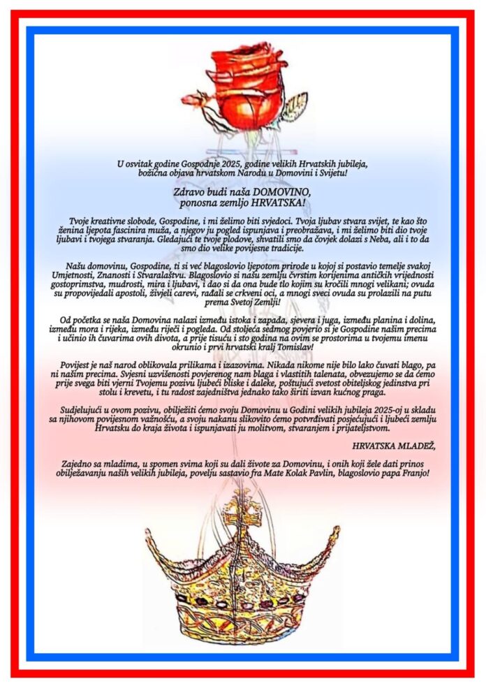 Hrvatska mladost uvijek je bila nositelj nade i svjetlosti za naš narod. Vi ste budućnost naše domovine, ali i sadašnjost koja ima snagu oblikovati svijet po uzoru na Kristovu ljubav. Pozivamo vas da ovaj Božić provedete u promišljanju o svojoj ulozi u zajednici, dajući primjer vrline, dobrote i hrabrosti.