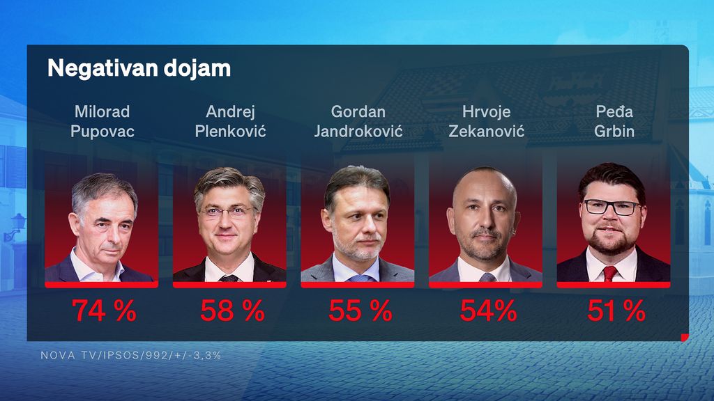 Na ljestvici negativnog dojma predvodi Milorad Pupovac, kojeg negativno doživljava 74 % ispitanih. Slijedi Andrej Plenković s 58 %, Gordan Jandroković s 55 %, Hrvoje Zekanović s 54 %, a na petom mjestu je Peđa Grbin, koji negativan doživljaj izaziva kod 51 posto ispitanih.