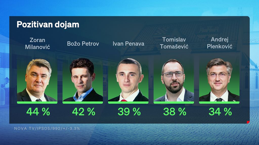 Na prvom je mjestu Zoran Milanović, kojeg pozitivno doživljava 44 % ispitanih. Iako je Milanović na prvom mjestu, njegovi prethodnici, kao i prethodnica, u pravilu su ostvarivali bolje rezultate. Na drugom je mjestu Božo Petrov, kojeg 42 posto ispitanih doživljava kao pozitivca. Na trećem je mjestu Ivan Penava, kojemu podršku daje 39 % ispitanih. 38 % ispitanih podršku daje Tomislavu Tomaševiću, a 34 % Andreju Plenkoviću.