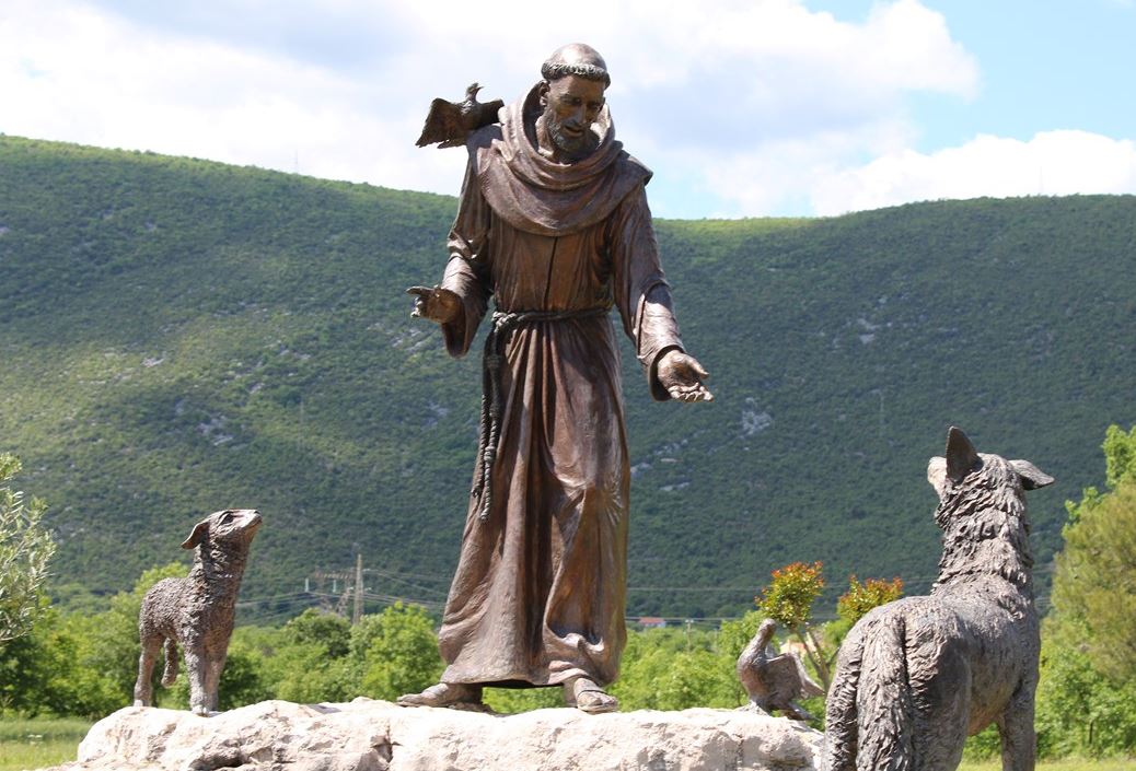 Najpoznatija priča koja Svetog Franju Asiškog povezuje sa životinjama jest ona o vuku. Stanovnici grada Gubbia dugo su živjeli u strahu od vuka koji je napadao njihovu stoku i njih same. U želji da stanovnike oslobodi straha i gradu donese mir, Franjo se sprijateljuje s opasnim vukom s kojim postiže dogovor da više ne napada ljude, a oni će ga zauzvrat hraniti. Tako je i bilo dok vuk nakon dvije godine nije uginuo. Osim dijaloga mira s vukom, sv. Franjo poznat je po prijateljstvu s pticama poput lastavica, sokola, grlica, fazana, ševama, ribama i ostalim životinjama. Franjo Asiški (pravo ime Giovanni Bernardone), osnivatelj Franjevačkoga reda (Assisi, 1181. ili 1182 – Assisi, 1226). Sin bogata trgovca u Assisiju i majke Francuskinje (po kojoj ga je otac zvao Francesco). Nakon bolesti i obraćenja napustio je obiteljsku kuću i od 1208. živio kao prosjak (odatle mu nadimak il Poverello – Siromašak) i putujući propovjednik, brinuo se za gubavce i popravljao ruševne crkve. Njegovo propovijedanje o ”evanđeoskom siromaštvu” brzo se širilo, pa su mu se već 1209. priključili prvi istomišljenici. Kako je broj pristaša brzo narastao, Franjo ih je okupio u Red manje braće (franjevci) i sastavio jednostavna pravila koja su se zasnivala na tekstovima Novoga Zavjeta; braća su se obvezivala na življenje u siromaštvu i pokori te služenju ljudima i Crkvi.