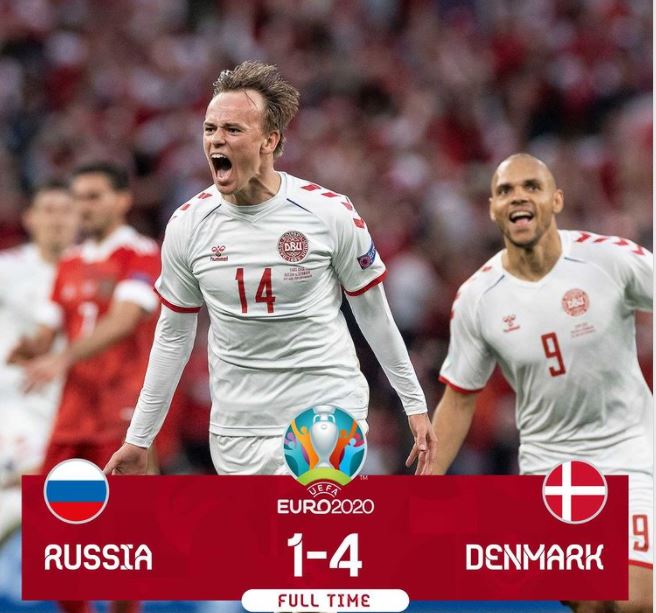 Samo tri minute poslije Joakim Maehle je zaključio bajkovitu dansku predstavu odmjerenim udarcem s ruba kaznenog prostora kojim je ostavio Safonova na krivoj nozi i postavio konačnih 4-1 za plasman Danaca u osminu finala s drugog mjesta u skupini.
