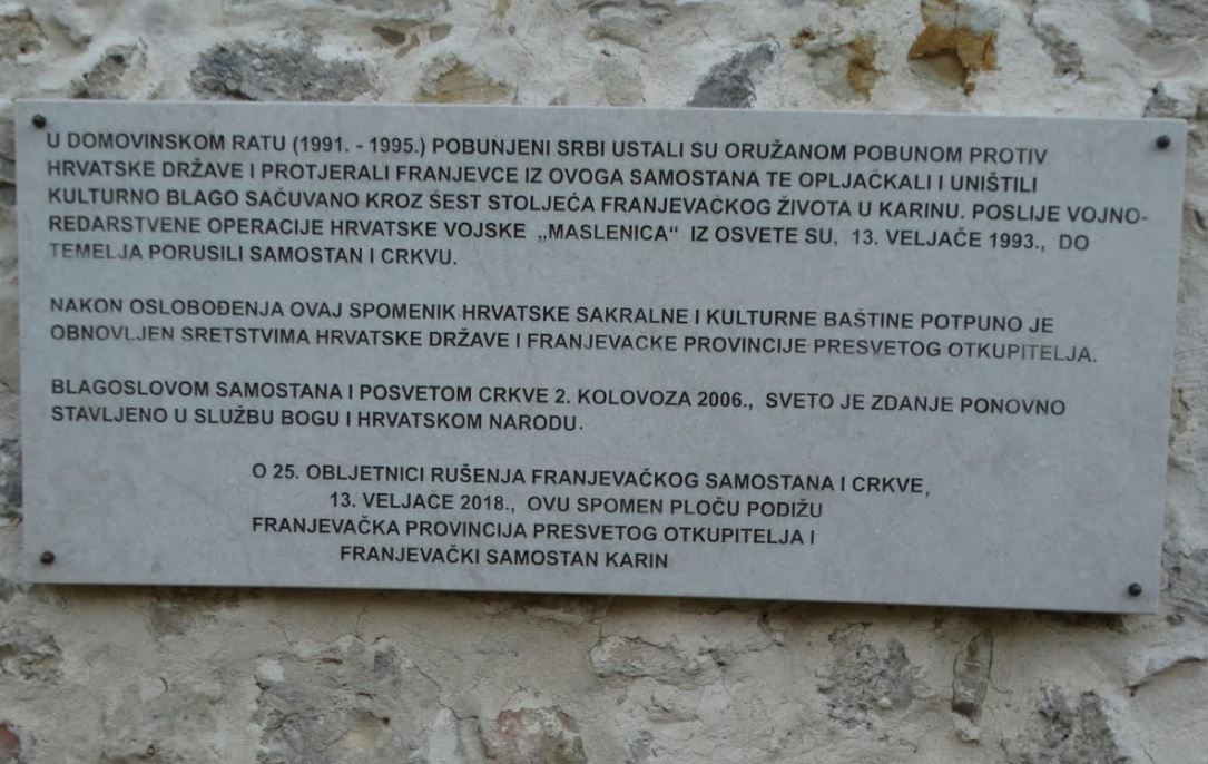 Pobunjeni Srbi, na tada okupiranom prostoru u znak odmazde zbog poraza za VRO Maslenica 13. veljače 1993. godine opljačkali su, miniranjem razrušili su i obeščastili crkvu , zajedničku fratarsku grobnicu , franjevački samostan u Karinu -spomenik kulture.