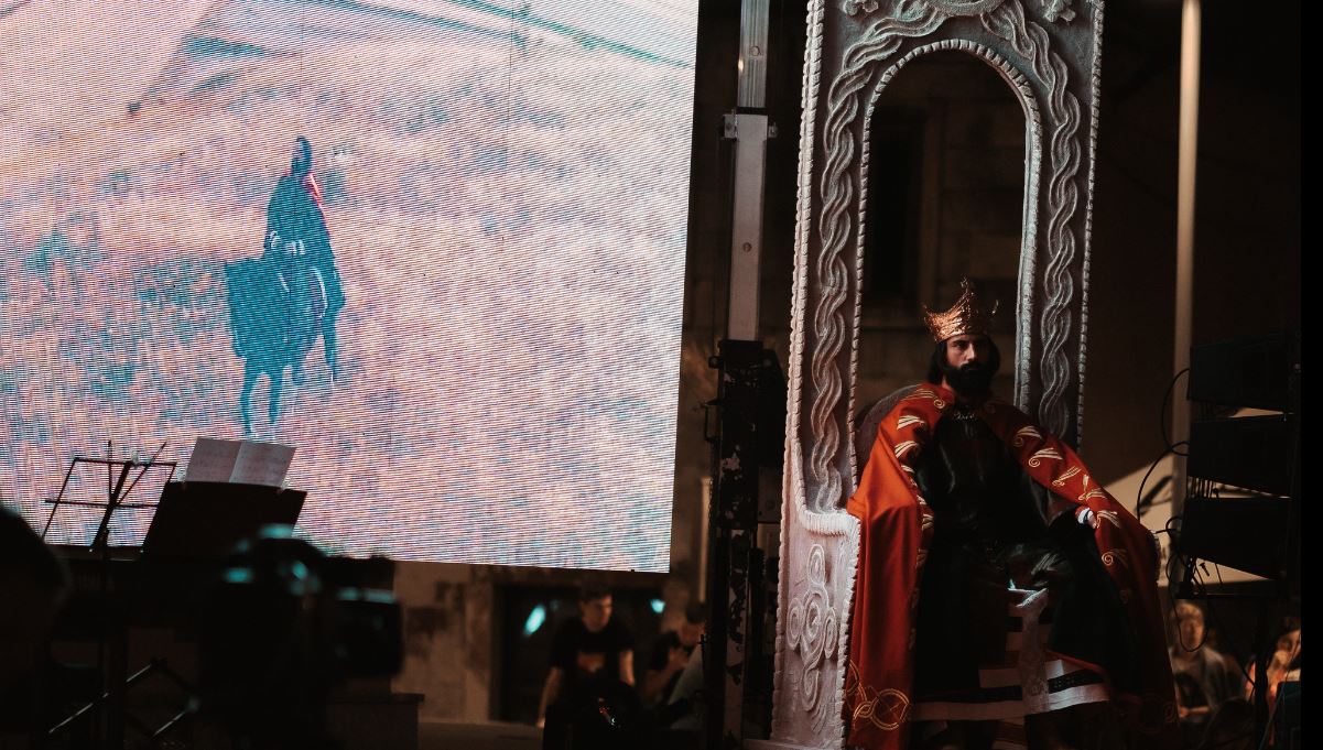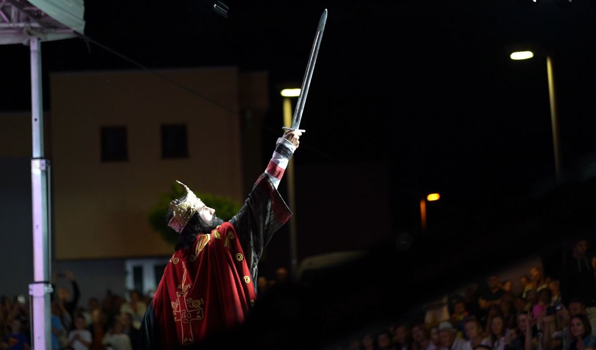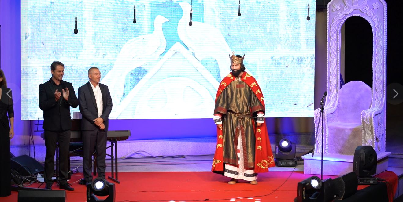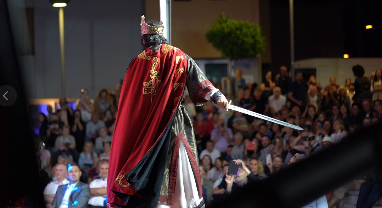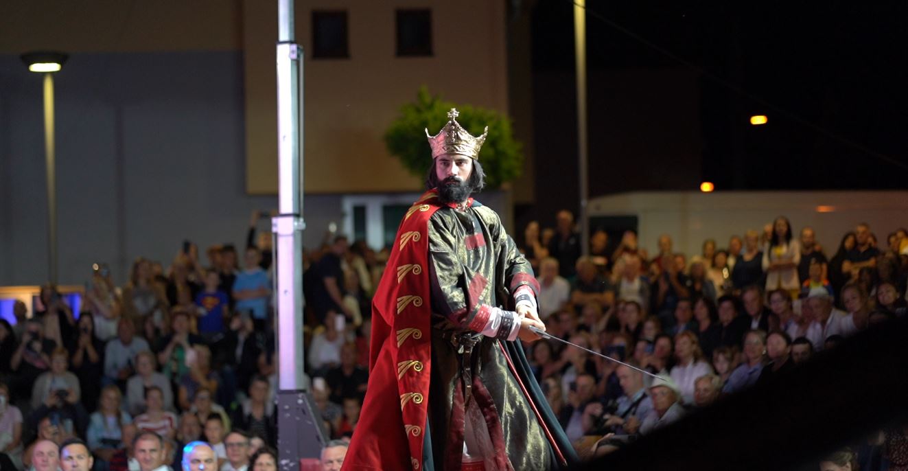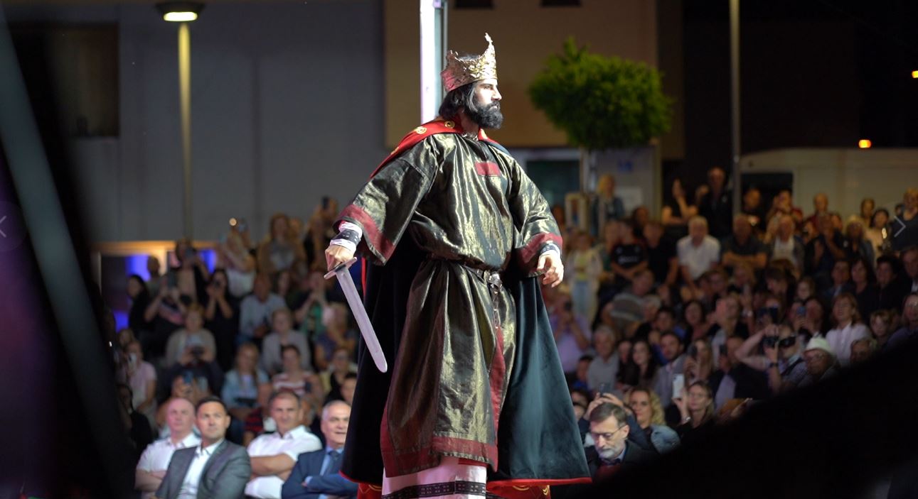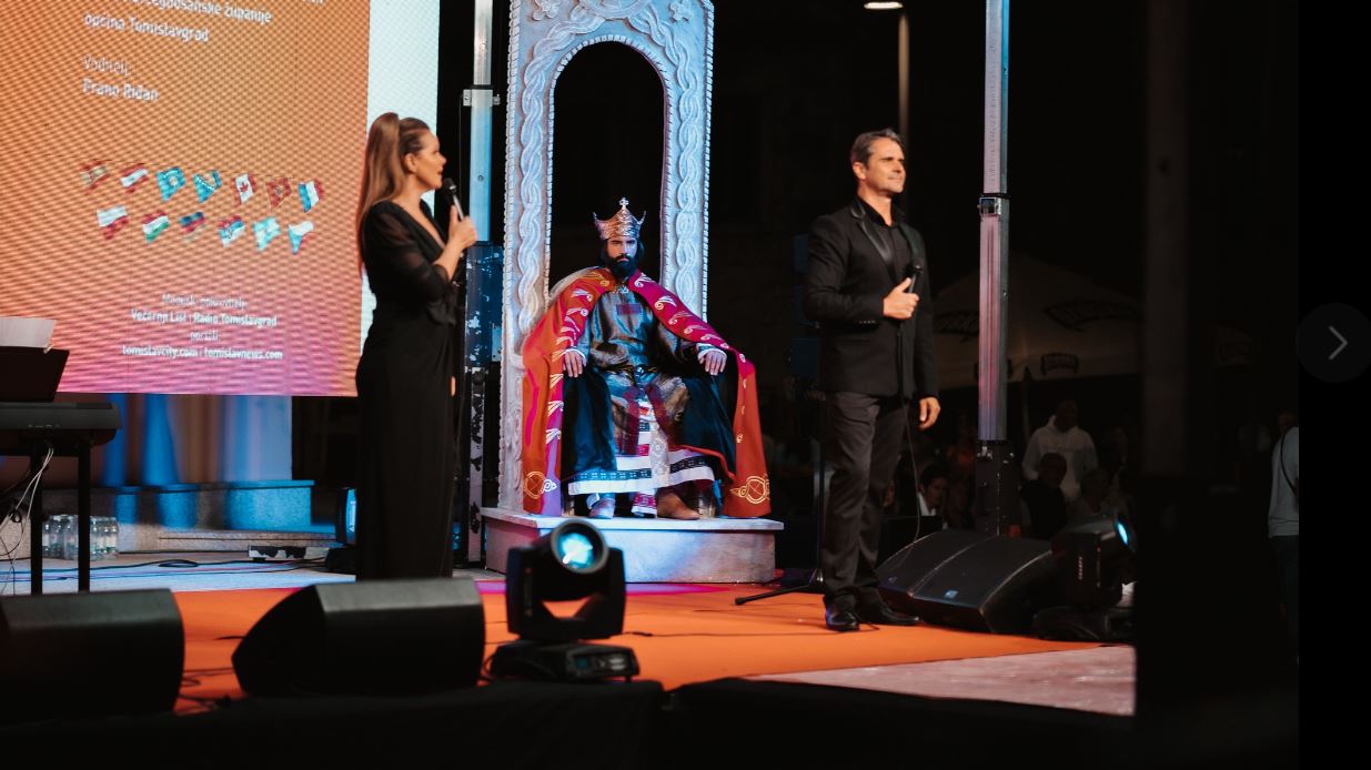 Na pozornicu je ušetao kralj Tomislav u prekrasnoj odori i s krunom na glavi i zauzeo kraljevsko prijestolje, dok su istodobno na zidu prikazivani prigodni videi iz povijesnih serija u kojima se govori o kralju Tomislavu. U ulozi kralja Tomislava na postolju, na sceni na Trgu bio je glumac Josip Tabak, koji je i u povijesnoj seriji “Hrvatski kraljevi”, koja je prikazivana na HTV, glumio kralja Tomislava, donosi tomislavnews .