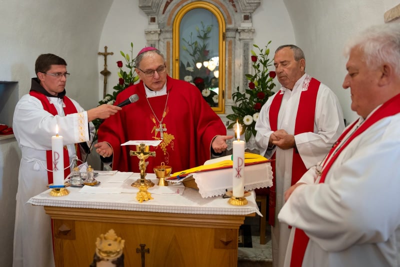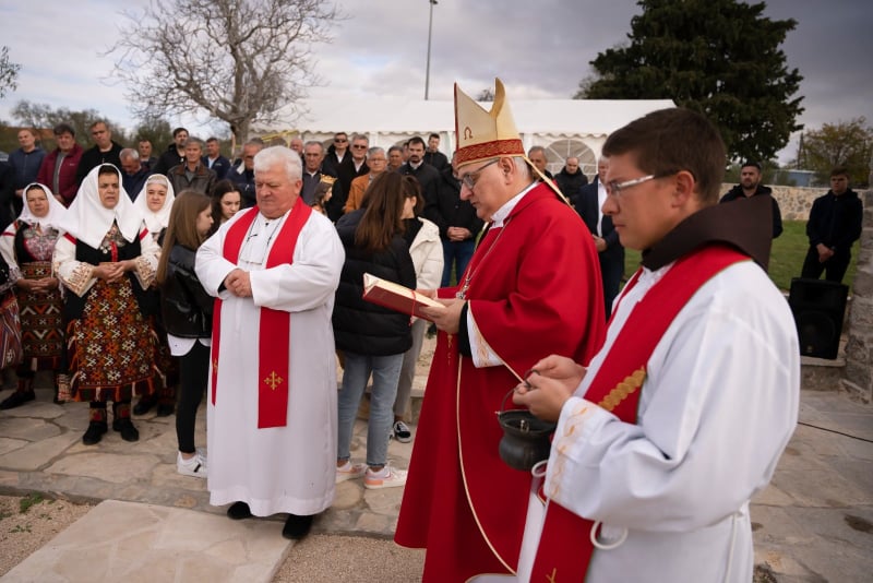 Misno slavlje predvodio mons. Tomislav Rogić šibenski biskup u koncelebraciji sa župnikom fra Dujom Jukićem, fra Petrom Teskerom, fra Božom Duvnjakom i fra Tomislavom Brekalom. Prije početka misnog slavlja biskup Tomislav Rogić blagoslovio obnovljenu crkvu sv.Kate .