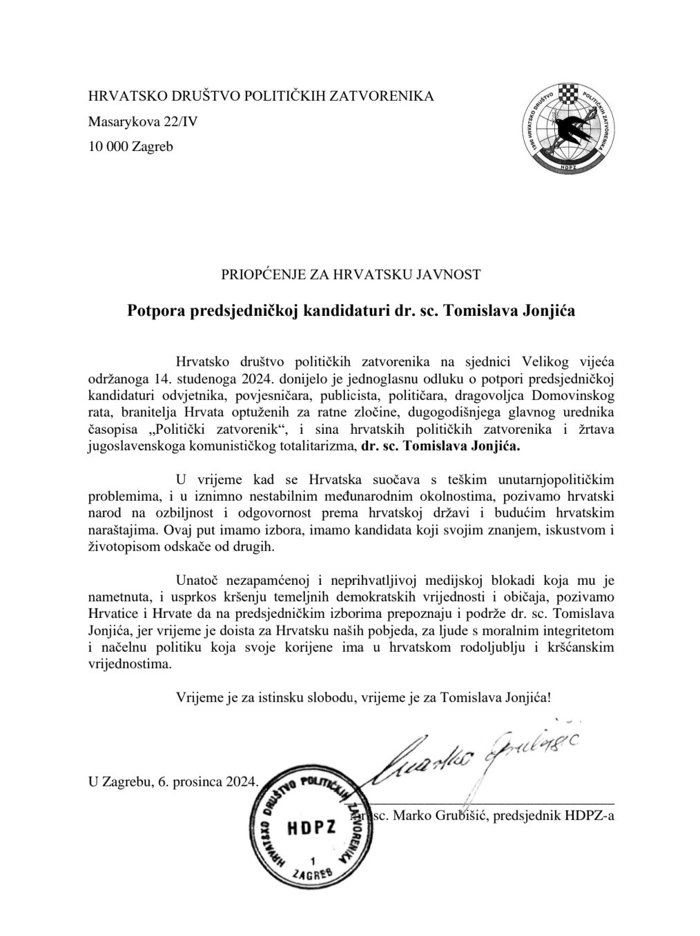 Kandidat za hrvatskog predsjednika Tomislav Jonjić na svom facebook profilu napisao je kako Hrvatsko društvo političkih zatvorenika (HDPZ) okuplja ljude koji su u najtežim i najmračnijim vremenima za Hrvatsku bili utjelovljenje hrvatskog ponosa i neslomljivoga ljudskog dostojanstva.
