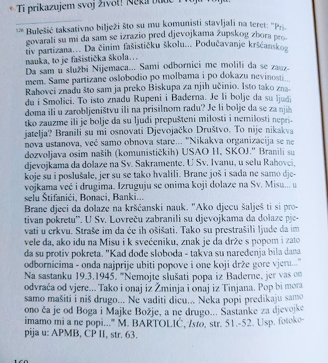 Da sam u službi Nijemaca… Sami odbornici me molili da se zauzmem. Same partizane oslobodio po molbama i po dokazu nevinosti…. Rahovci znadu što sam ja preko Biskupa za njih učinio. Isto tako znadu i Smolici. To isto znadu Rupeni i Baderna. Je li bolje da su ljudi doma ili u zarobljeništvu ili na prisilnom radu? Je li bolje da se za njih tko zauzme ili je bolje da su ljudi prepušteni milosti i nemilosti neprijatelja? Branili su mi osnovati Djevojačko Društvo. To nije nikakva nova ustanova, već samo obnova stare… “Nikakva organizacija se ne dozvoljava osim naših (komunističkih) USAO H, SKOJ.” Branili su djevojkama da dolaze na Sv. Sakramente. U Sv. Ivanu, u selu Rahovci, koje su i poslušale, jer su se tako hvalili.
