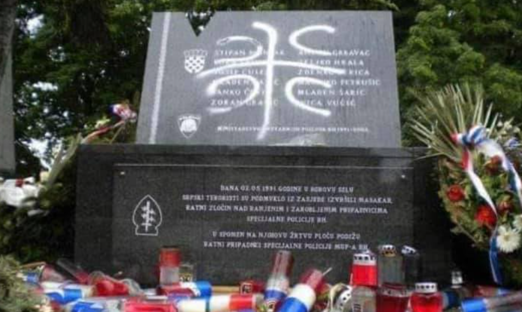 FOTO-Facebook-Nikola Kajkić-ČETNIČKI SIMBOLI NA SPOMENIKU UBIJENIM I IZMASAKRIRANIM HRVATSKIM POLICAJCIMA I RAZBACANI VIJENCI I SVIJEĆE