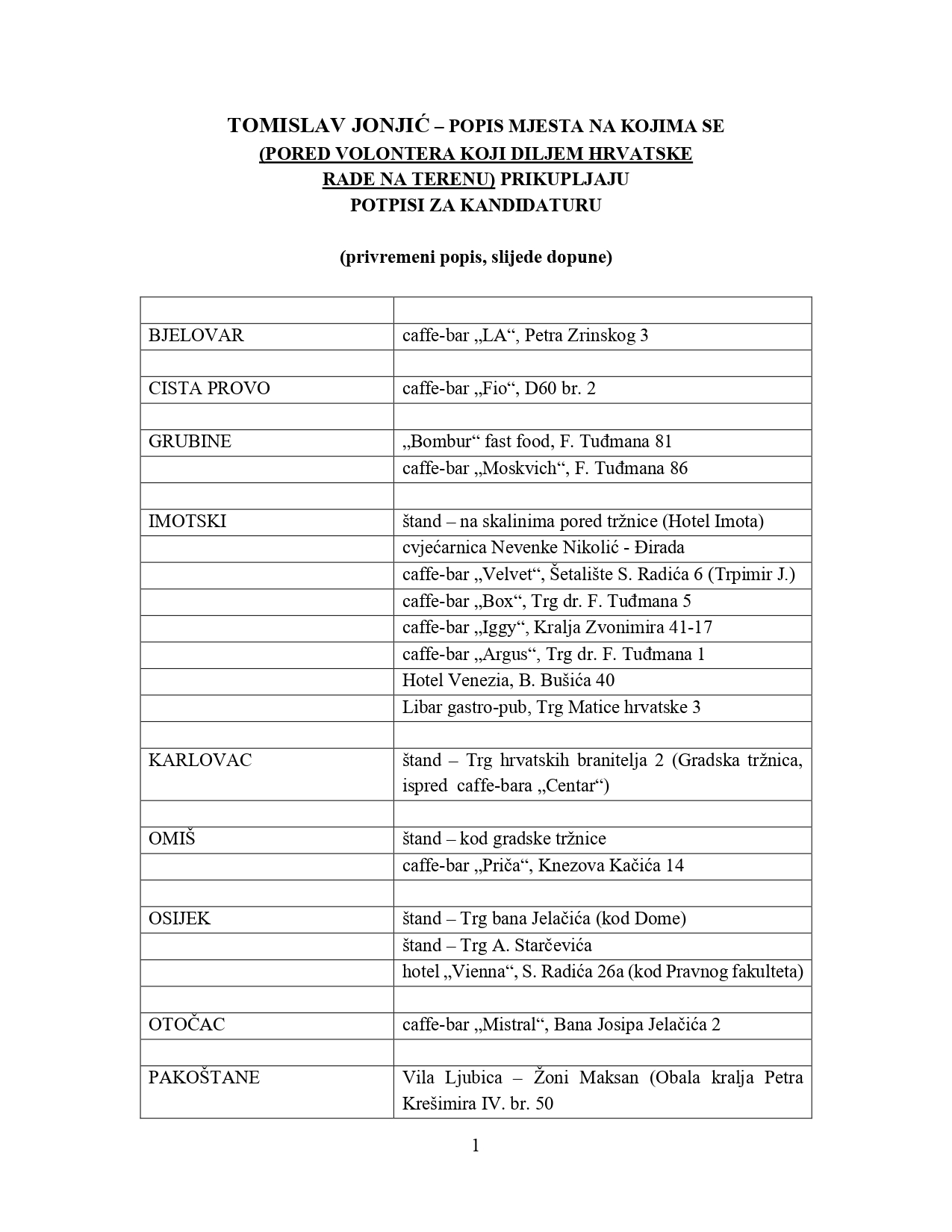”Vjerujemo da će biti još lokacija pa ćemo i eventualna ažuriranja tog popisa pravodobno objaviti. Želim svima zahvaliti na angažmanu i pomoći, okupili smo se u velikom broju – usprkos svim preprekama i pokušajima sabotaže – i to mi na ljudskoj i osobnoj razini znači neizmjerno puno. Idemo dalje, s odgovornošću i dostojanstvom graditi našu Hrvatsku!”, poručio je Jonjić.