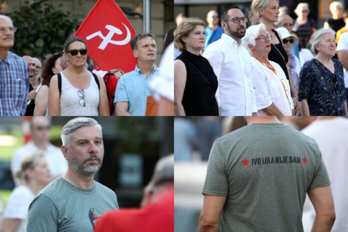 Kao i gotovo svaki put kad ljevica organizira neko “obilježavanje”, i jučer smo na Trgu žrtava fašizma mogli vidjeti skandalozna obilježja iz vremena SFRJ. Neki od okupljenih mahali su velikim crvenim zastavama ukrašenim komunističkim simbolima – srpom i čekićem, dok su drugi došli odjeveni u majice “ukrašene” crvenim zvijezdama petokrakama.