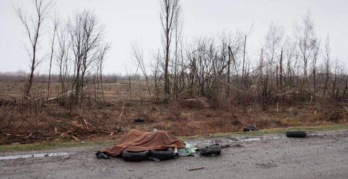 Mrtvi civili viđeni su u blizini autoceste 20 km izvan Kijeva. Ispod deke je 4-5 mrtvih golih žena koje su 🇷🇺 barbari pokušali spaliti tik uz cestu. Autor fotografije –Photo by @mpalinchak#russiawarcrimes