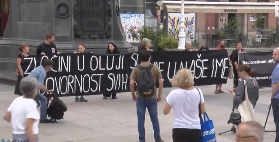 Aktivisti i aktivistice iz Centra za žene žrtve rata, Centra za građansku hrabrost, Ženske mreže Hrvatske i Udruženja za društvena istraživanje i komunikacije iz Sarajeva došli su na glavni zagrebački trg s transparentima: “Zločini u Oluji su odgovornost svih nas”, “Ne u naše ime” te “Nacionalizma ubija” napisan na latinici i ćirilici.