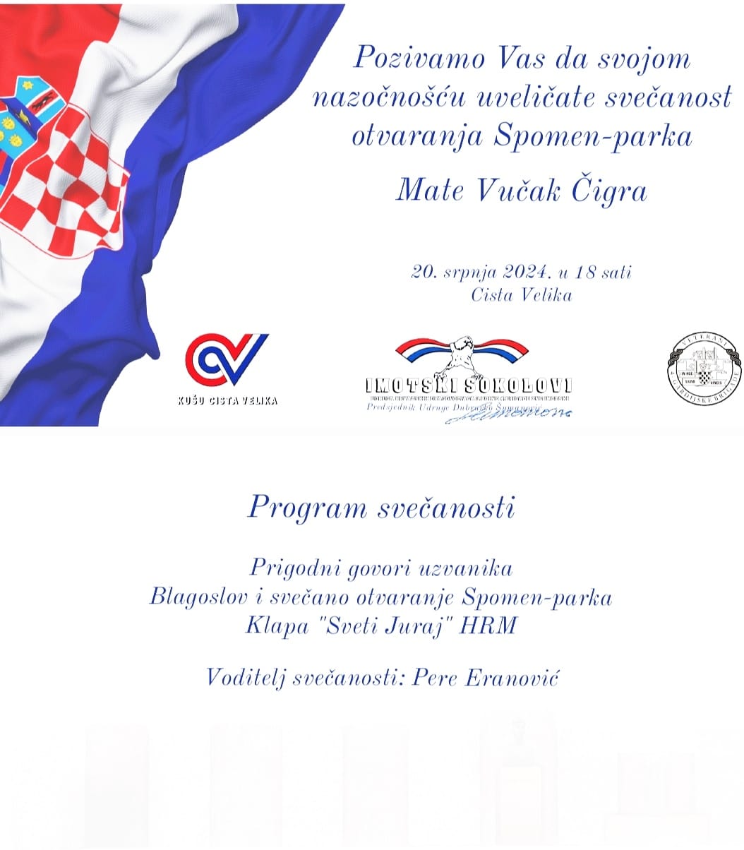 Ovim putem Vas pozivamo na svečano otvorenje spomen-parka Mate Vučak- Čigra, koje će se upriličiti 20. srpnja s početkom u 18 sati u Cisti Velikoj.