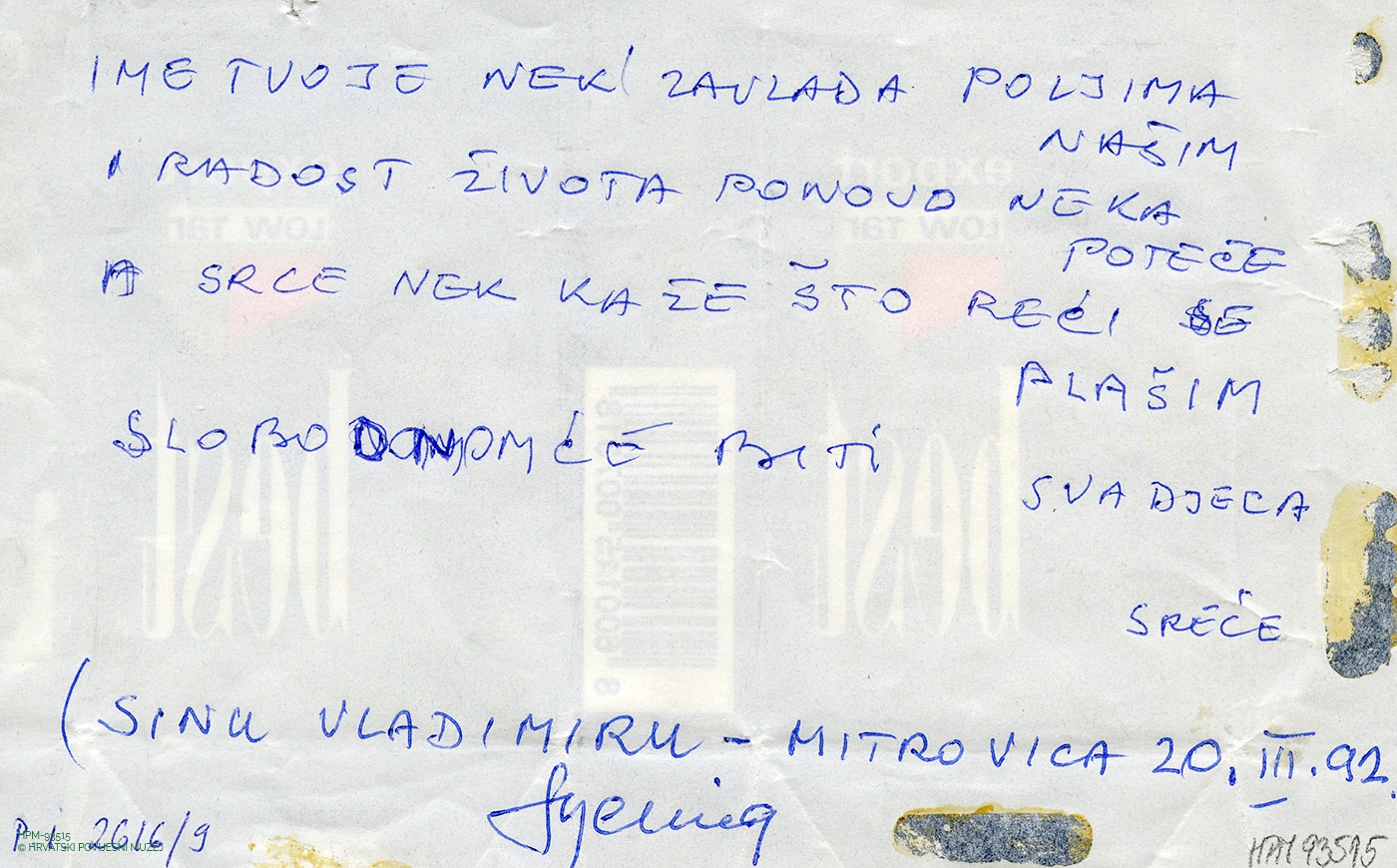 Tekst pjesme glasi: „IME TVOJ NEK´ ZAVLADA POLJIMA / NAŠIM // I RADOST ŽIVOTA PONOVO NEKA /POTEČE // A SRCE NEK KAŽE ŠTO REĆI SE / PLAŠIM / /SLOBODNOM ĆE BITI SVA DJECA / SREĆE”. Pjesma je napisana na unutrašnjoj bijeloj stranici omota cigareta Best u logoru Sremska Mitrovica. Otac i sin Kenigskneht u logorima Stajićevo i Sremska Mitrovica proveli su 125 dana, od 18. 11. 1991. do 27. 3. 1992.