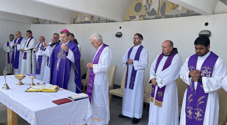 S nadbiskupom Vukšićem u koncelebraciji je bilo 16 svećenika, među kojima i provincijal Franjevačke provincije Bosne Srebrene fra Zdravko Dadić te sarajevski dekan i župnik na Marijin Dvoru, na području čije župe se i nalazi spomenuto groblje, mons. Anto Ćosić koji je na početku euharistijskog slavlje pozdravio nazočne vjernike, njih nešto više od stotinu.