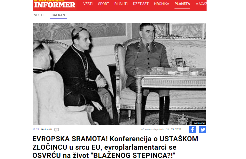 Informer pak u utorak pod naslovom EUROPSKA SRAMOTA! Konferencija o USTAŠKOM ZLOČINCU u srcu EU, zastupnici u Europskom parlamentu PREISPITUJU život “BLAŽENA STEPINCA?!”, i kasnije u srijedu pod naslovom “EU SLAVI STEPINCA! PAVELIĆEVOG KARDINALA PROGLASILI ZA MUČENIKA! Skandalozan potez zvaničnika u Briselu!”, piše: