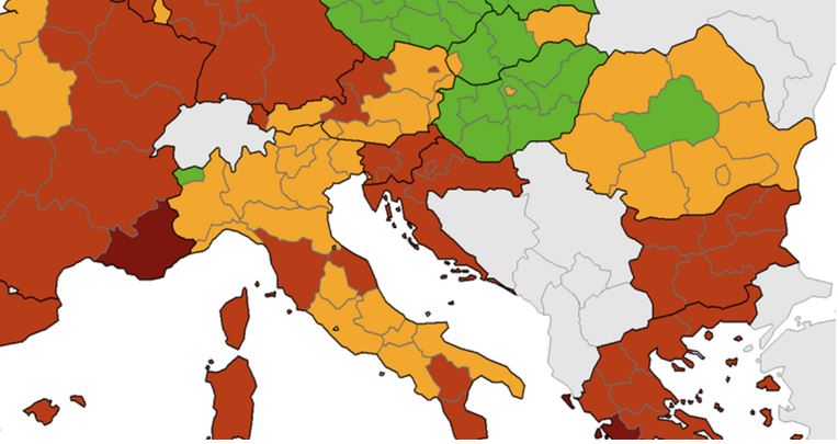 Epidemiološka karta ECDC-a za Europu objavljuje se svaki tjedan na temelju 14-dnevne incidencije i udjela pozitivnih testova u ukupnom broju testiranih.Hina