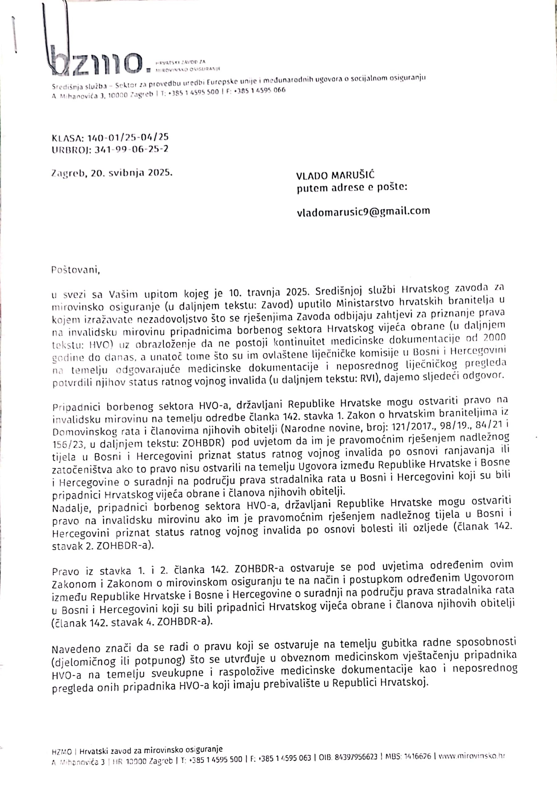 DOKAZI:Dopis HZMO od 20.svibnja 2025.godine: