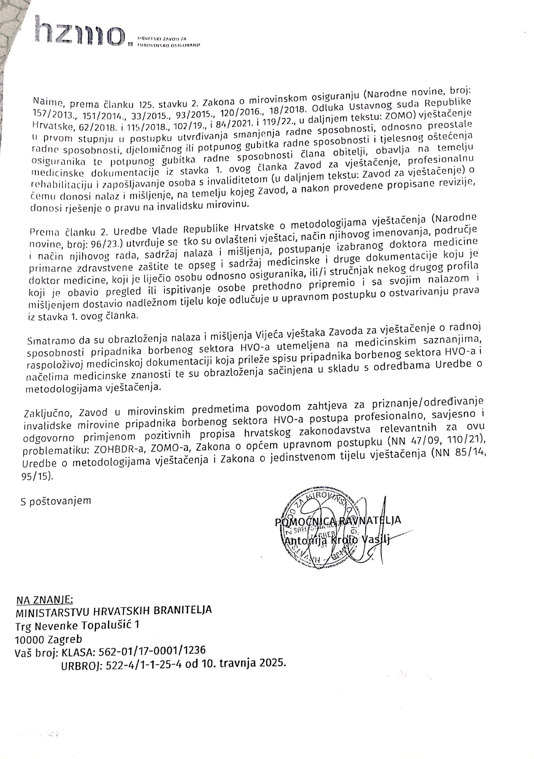 U odgovoru se navodi kako HZMO po nadležnim liječničkim komisijama vrši vještačenje medicinske dokumentacije i neposrednog pregleda pripadnika HVO-a, RVI,po njihovim ovlaštenim vještacima, i gdje HZMO smatra kako su obrazloženja nalaza i mišljenja Vijeća vještaka Zavoda za vještačenje o radnoj sposobnosti pripadnika borbenog sektora HVO-a utemeljena na medicinskim saznanjima, raspoloživoj medicinskoj dokumentaciji koja prileže spisu pripadnika borbenog sektora HVO-a i načelima medicinske znanosti te su obrazloženja sačinjena u skladu s odredbama Uredbe o metodologijama vještačenja.